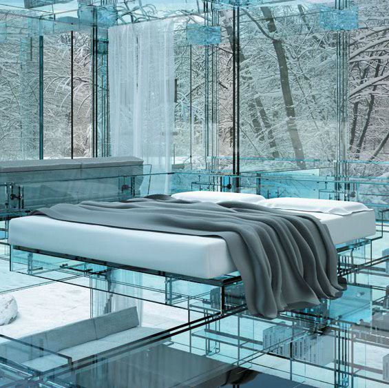 To showcase his glass furnishings collection named Simplicity (the individual items of which are shown later in this post), he has designed two transparent glass concept homes.