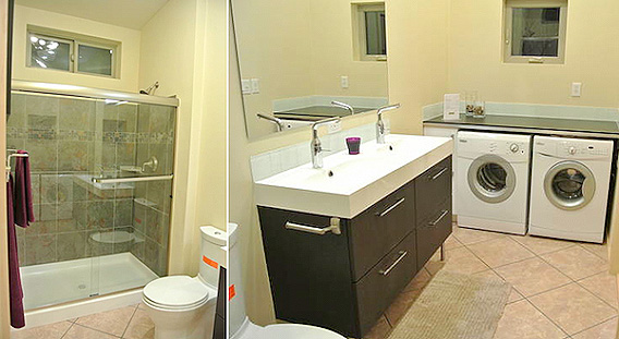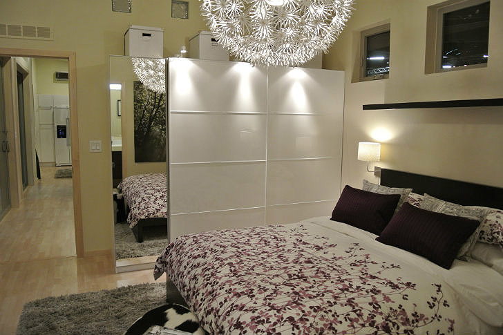 The bath features a “huge” two sink vanity and four drawers along with a storage cabinet. The bedroom features the amazingly functional IKEA built-in series of closet systems.